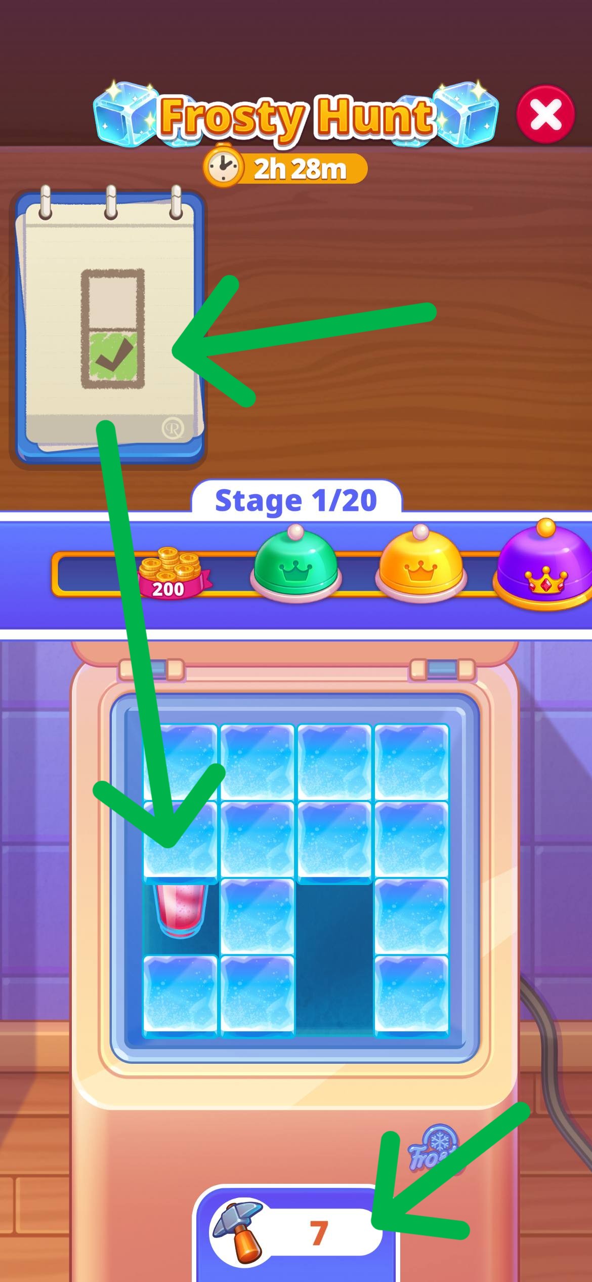 Each Frosty Hunt event consists of multiple stages. To complete a stage, you need to find all required items shown at the top of the screen hidden under the ice.