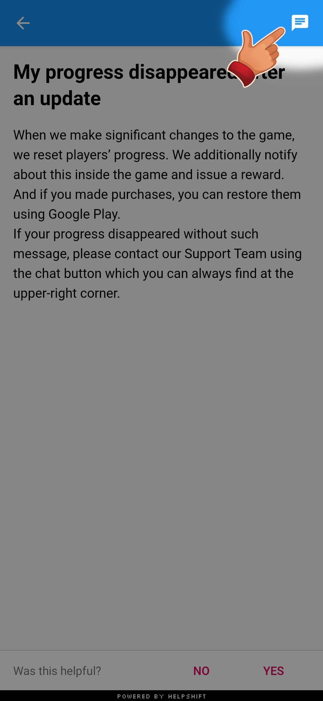 如果没有这样的消息你的进度消失,请使用你可以随时在右上角找到的聊天按钮联系我们的支持团队。